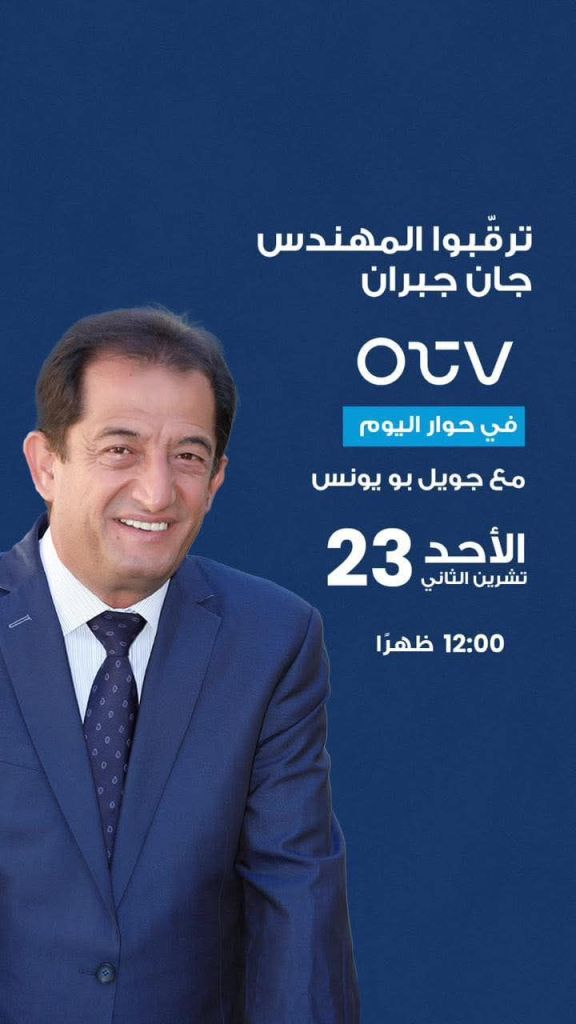 Previous Postjbail Al Akwa News:ترقّبوا المهندس جان جبران ، غداً الأحد على شاشة OTV ، في تمام الساعة ١٢ ظهراًNext PostFollow this link to join my WhatsApp group: https://chat.whatsapp.com/F3uNzGux4nD8hDzxOuzKIL