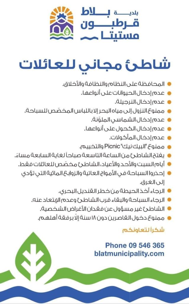 وعلى الرواد الالتزام بتوجيهات فريق الإنقاذ (maitres najeurs) المكلّف من قبل البلديّة للسهر والحرص على سلامة المواطنين…
